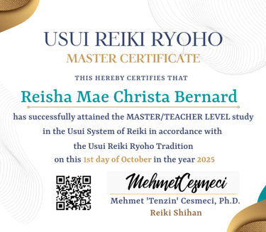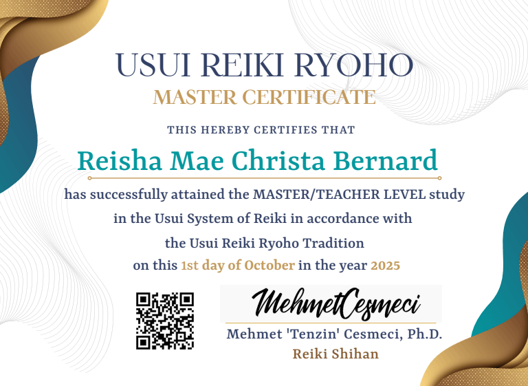 “Certified Master Reiki Practitioner, trained in advanced methods of energy alignment and healing.”